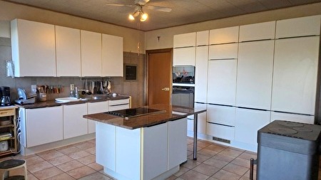 Inkomhal met open trap en vestiaire, WC, ruime woonkamer met schouw (houtcassette), ingerichte keuken met houtkachel, veranda, bijkeuken met uitgang naar de tuin, bureau, 2e salon met schouw (houtcassette), slaapkamer, badkamer (bad/douche, meubel met 2 lavabo’s, jacuzzi en WC).