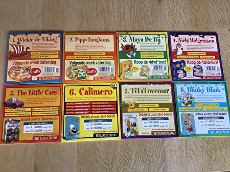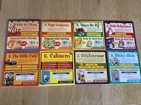 8 Animatie DVD' s voor kinderen, gezien op TV ; TOPNu met de vakantie voor de deur ,en bij slecht weer eventueel , als tijdverdrijf voor de kinderen ,met bekende namen zoals DVD Nr.1 / Wickie de Viking uit 2 afleveringen ,48 Min. ,DVD Nr.2 / Pippi Langkous ,bestaat uit 3 afleveringen ,75 Min. DVD Nr.3 / Maya De Bij , bestaat uit 2 afleveringen , 48 Min. " " "DVD Nr.4 / Niels Holgersson ; bestaat uit 3 afleveringen , 75 Min. " "DVD Nr.5 / The Little Cars ; bestaat uit 4 afleveringen , 82 Min. " "DVD Nr.6 / Calimero ; bestaat uit 8 afleveringen ,115 Min. " "DVD