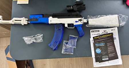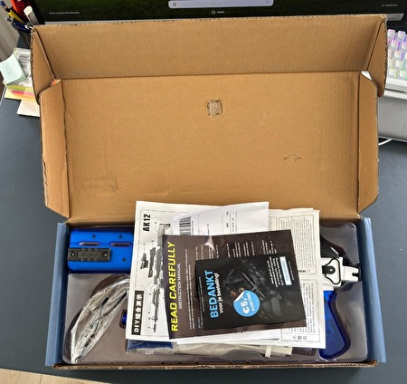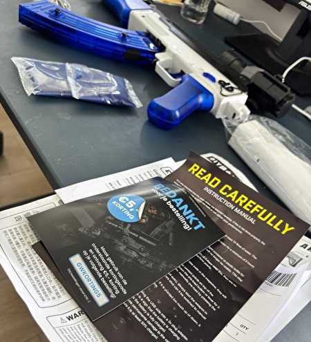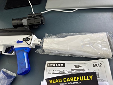 Een speelgoedgeweer model AK12 dat zachte watergel-balletjes schiet. De set is een bouwpakket (DIY) en moet nog in elkaar gezet worden.Nieuw in doos. Alle onderdelen zitten nog in de originele verpakkingen.