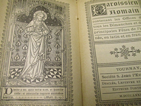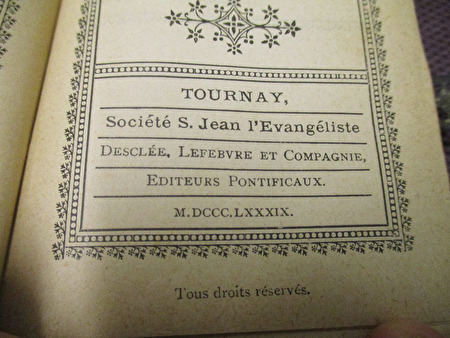 Antiek gebedenboek "Paroissien Romain",gedrukt bij Tornaci,anno 24 september 1888-G.F.J.Bouvry Vic.genummerd exemplaar nr.:340.Gezien zijn leeftijd nog in mooie staat met gebruikssporen en ouderdomsvlekken.Geen gescheurde bladzijdenNiets in geschreven.Voorzien van verharde,crèmekleurige kaft,uitgewerkt met