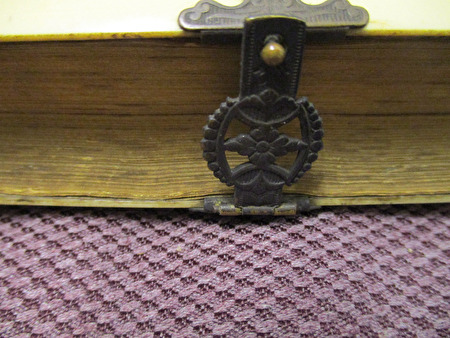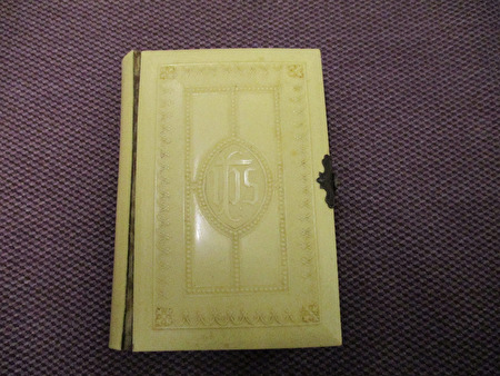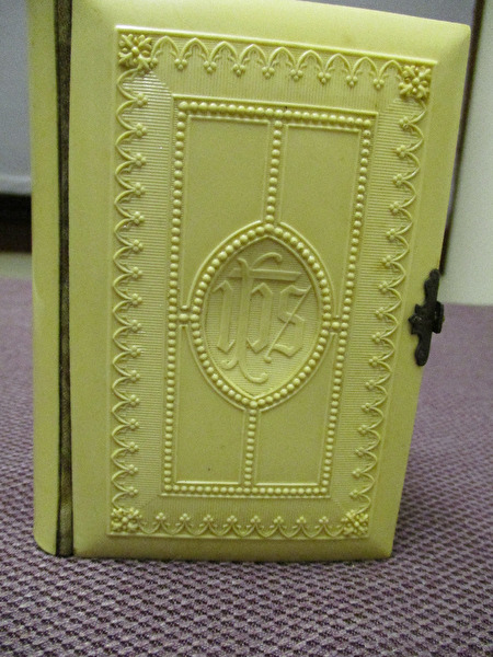 decoratie en in het midden monogram.Tevens voorzien van mooi uitgewerkt koperen slotje,om het boek perfect af te sluiten.Binnenin een aaneenschakeling van gebeden,vespers,kerkgebeden en teksten voor gezangen.