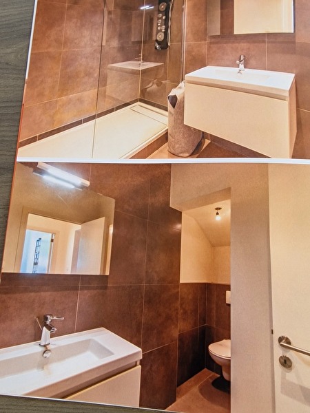 Volledig uitgeruste moderne badkamer betegeld, grote inloopdouche.