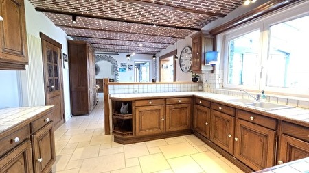 Inkomhal met open trap en vestiaire, ruime woonkamer (+- 35m²) met natuurstenen schouw en houtcassette, ingerichte keuken met ontbijthoek en toegang tot een 2de leefruimte / veranda, bureau (mogelijkheid extra kamer), WC, wasruimte, grote garage en prachtig glazen bijgebouw met zwembad (10m x 5m, kleedruimte, douche en WC).