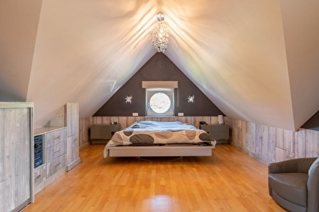 Nachthal met mezzanine en zicht op de inkomhal, grote ouderlijke slaapkamer met inmaakkasten, 1ste badkamer (inloopdouche, ligbad, meubel met dubbele lavabo, toilet), 4 slaapkamers waarvan 2 met maatmeubilair, dressing, 2de badkamer (douchen lavabo met meubel, toilet), berging (mogelijkheid aparte WC).