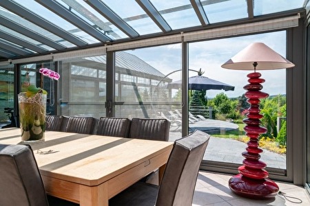 Prachtig eigendom met ruime natuurstenen woning, schitterende veranda met zwembad en pergola, gelegen op een mooi aangelegd grondstuk van 30a 61ca met waterpartij en boomgaard, vanwaar u een panoramisch uitzicht geniet over het Ardeense landschap.Ideaal voor liefhebbers van rust en natuur.