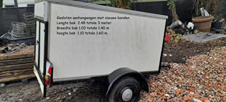 gesloten aanhangwagen nieuw banden te Ekeren 2180- lengte bak 2.48 totaal 3 meter,breedte bak 1.03 totaal 1.40 meter, hoogte bak 1.10 totaal 1.60 m. ideaal om fietsen enz te vervoeren. vraagprijs 500 europrijs : 500 €