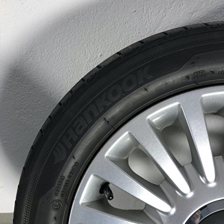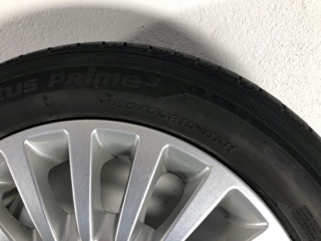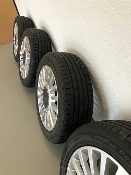 Set zomerbanden op originele fiat aluminium velgen met bijbehorende wieldeksels, geschikt voor Fiat 500. 4 x zomerbanden Hankook Ventus prime 3 - 185 x 55 R15 82H.