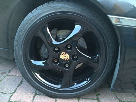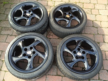 porsche zwart gelakte 18"-ers velgen met banden voor porsche boxster 986, 996 of andere