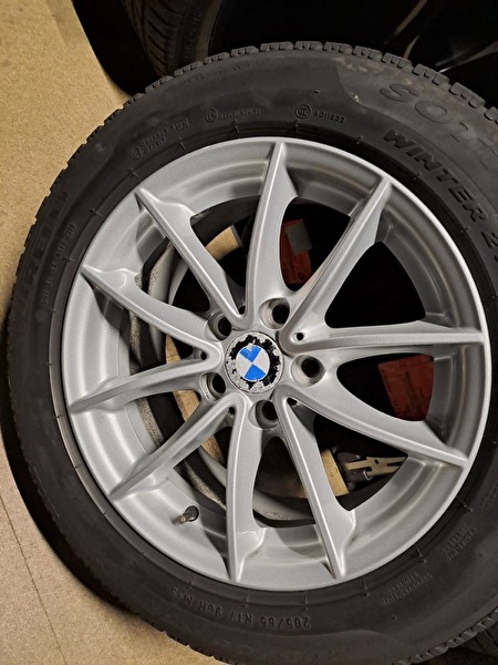4 winterbanden op originele aluminium BMW velgen 17 inch met profiel 5 mm, nog goed voor ca. 50000km, banden Pirelli 205/65 R17 96H M+S, momenteel in bandenhotel Jorssen Aartselaar (officiële BMW Dealer), steek (PCD) 5x120, compatibel o.a. met BMW reeksen 1, 3, 4, 5, X1, X3, X4, enz.prijs : 300 €