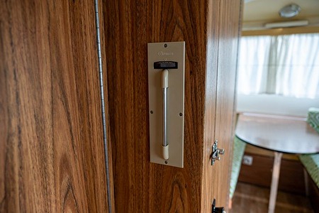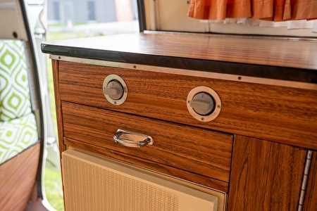 De indeling is typisch voor zijn tijd en bijzonder doordacht: meerdere zitbanken die kunnen dienen als slaapplaatsen, een centrale tafelopstelling, geïntegreerde keuken, opbergkasten en zelfs een afzonderlijke toiletruimte. Dankzij de grote ramen geniet het interieur van veel lichtinval, wat bijdraagt aan het open en luchtige karakter.