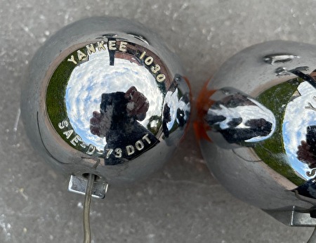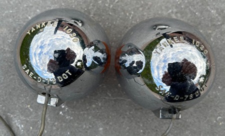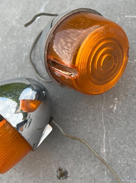 Harley shovelhead twee knipperlichten voor FX, XL, e.a. jaren '70 specificaties:YANKEE 1030, SEA-D-73-DOT chroom en lensjes ok