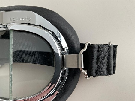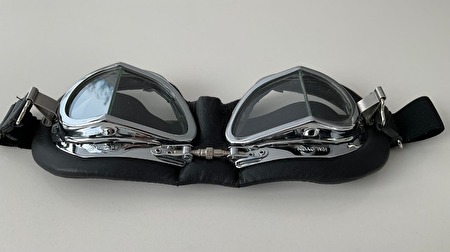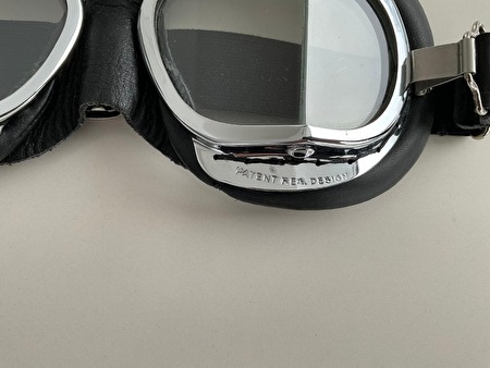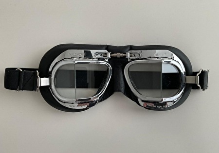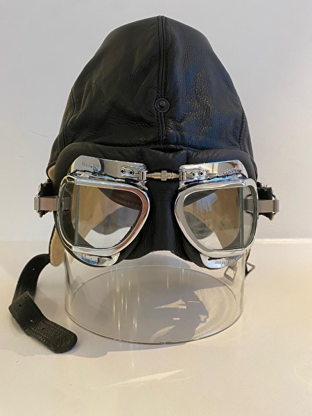 De zwart leren helm en compacte bril met verchroming en messing frames, zijn geschikt voor liefhebbers van luchtvaart, motors en klassieke auto's.
