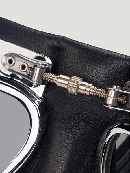 De leren helm heeft een vizier, oorkleppen en een achterlip ter bescherming tegen de wind en voorzien van een verstelbare gesp die hem stevig houdt tijdens het rijden.