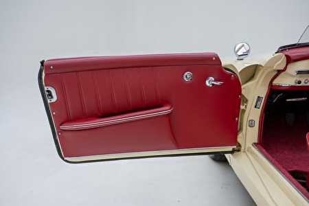 · Luxueus Origineel Interieur: Ondanks de sportieve aanpassingen is het originele, luxueuze lederen interieur behouden gebleven, uitgevoerd in de typische, opvallende kleurencombinatie van DB608 Elfenbein (ivoor) met een rood lederen interieur, zoals vaak gezien in de sportwagens van de jaren '50. Deze combinatie benadrukt het klassieke karakter van de auto en creëert een tijdloze, stijlvolle uitstraling die perfect past bij de sportieve lijnen van de 190 SLR.