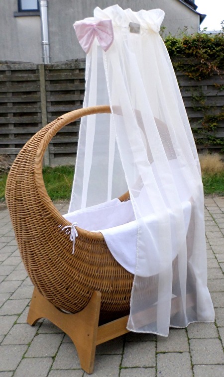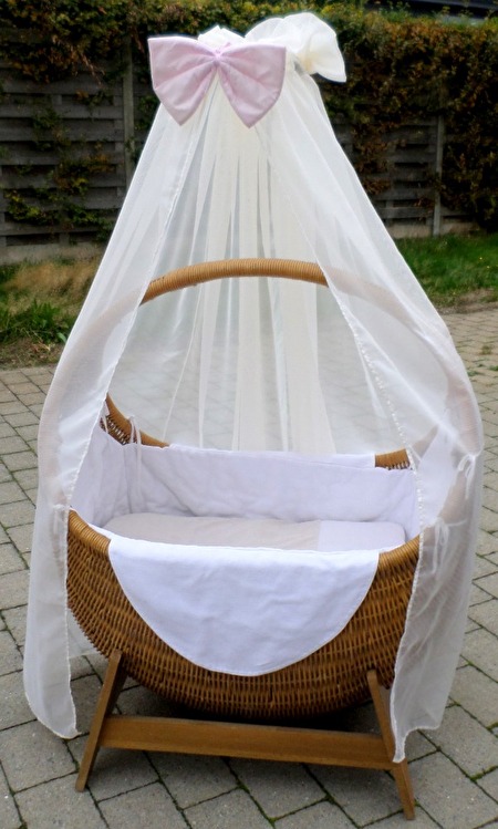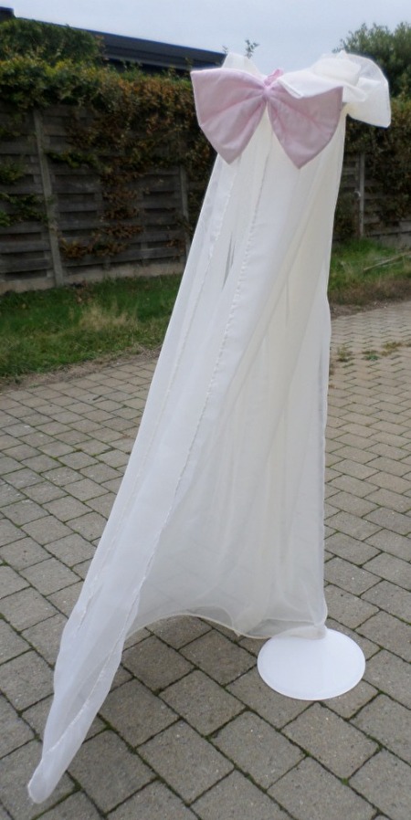 Met bijhorende staander en bijhorende witte hemelstaaf met de bijhorende champagne kleurige voille hemel met roze strik.