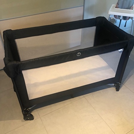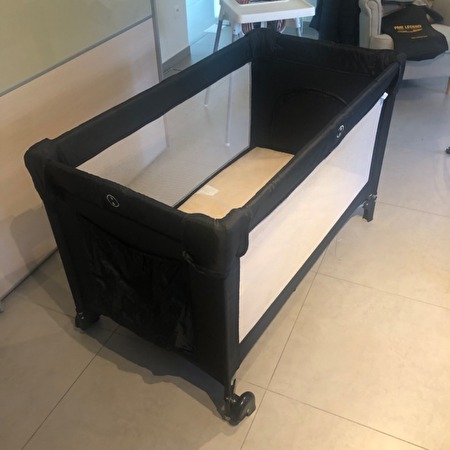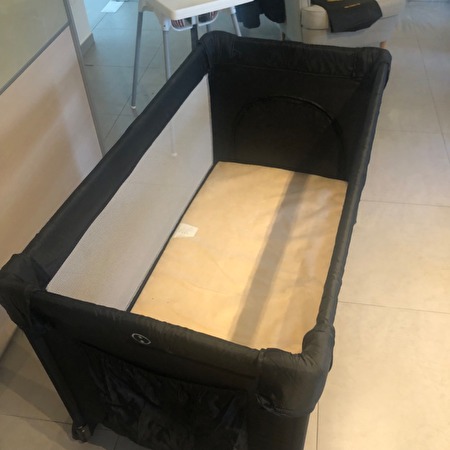 Opvouwbare babybedje, handig voor op vakantie, met matrasje en verhard bodem.