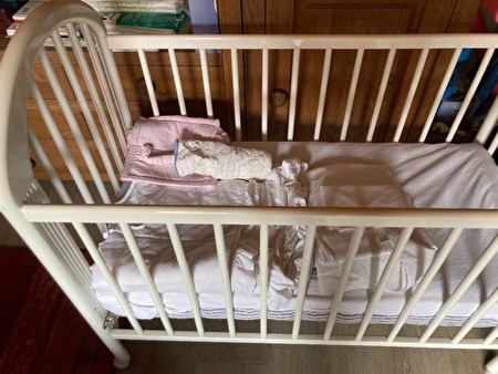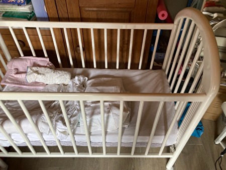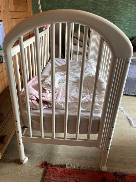 wit babybed op wieltjes met matras, lakens, pamperzak in zeer goede staat, af te halen regio Lichtaart