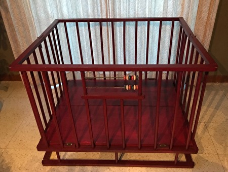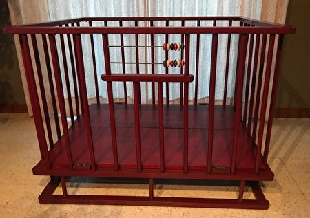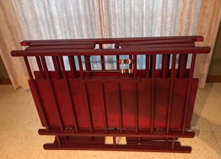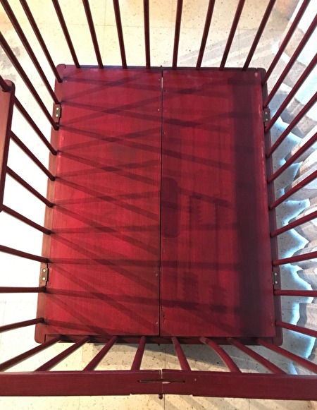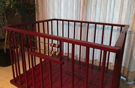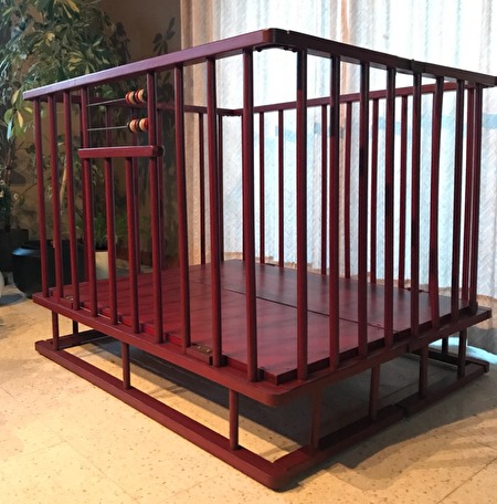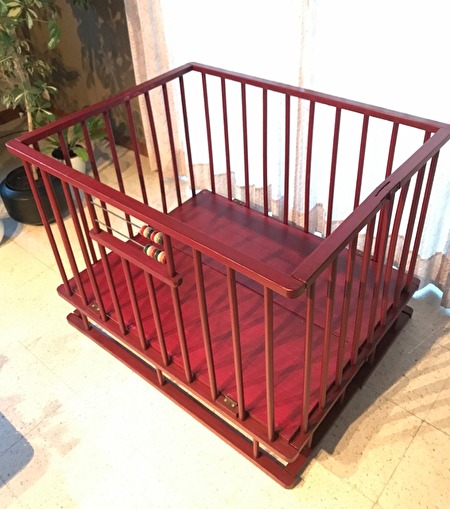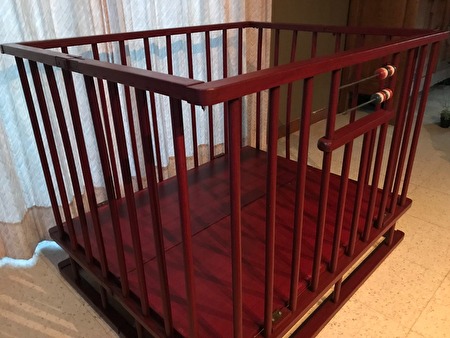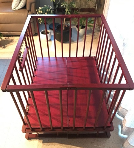 Het babypark is in hout, een donkerrode kleur, met ronde spijlen, lichte gebruikerssporen.Het park heeft een standaardgrootte van 1 meter lang en 80 cm breed. De hoogte is 75 cm (18 cm van de grond). De hoogte van de vloerplaat is niet verstelbaar.