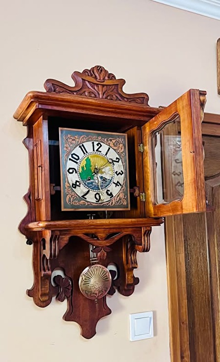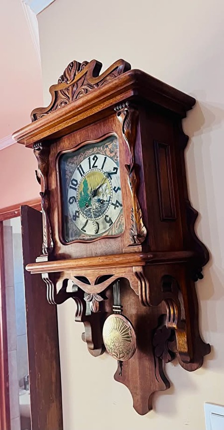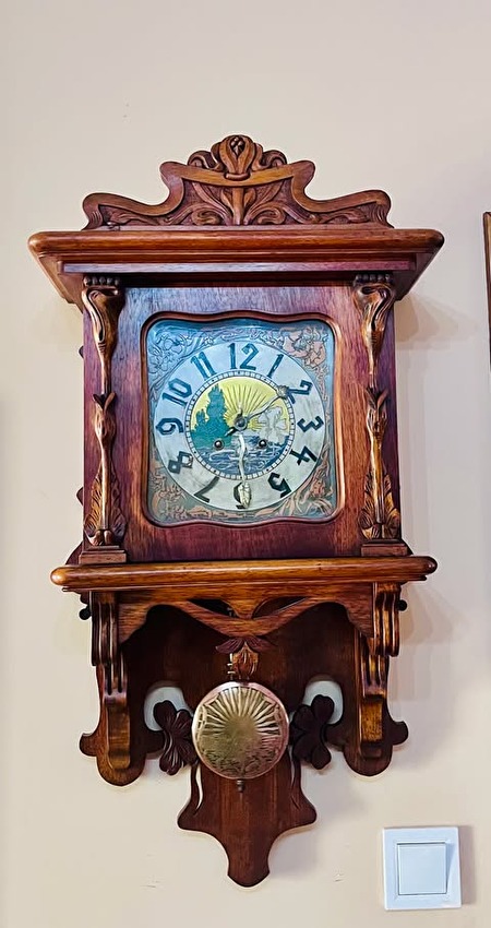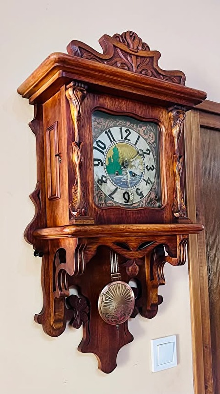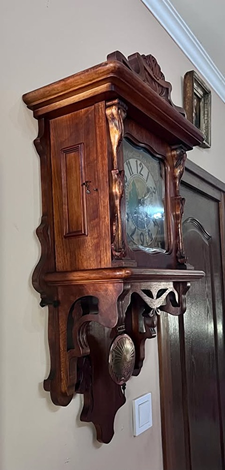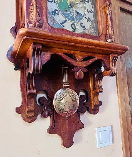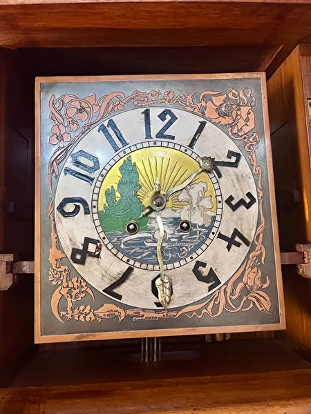 Jugend Still, uniek gesneden bibliotheekklok met halfslag, met originele opwindsleutel. Eind jaren 1880. 600 euro