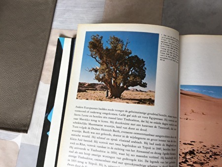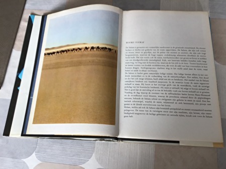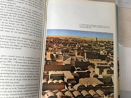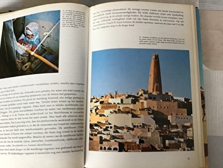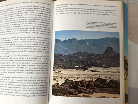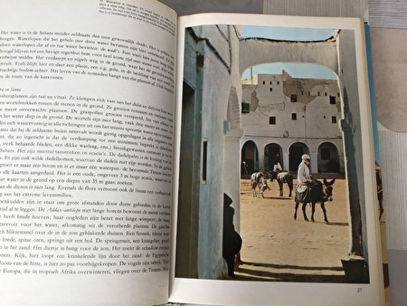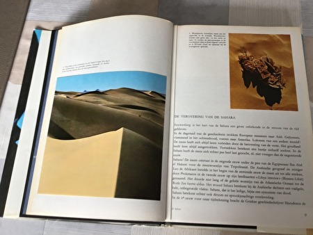 De Sahara is geenszins een onmetelijke zandoceaan in de gloeiende zonnebrand .De duinen beslaan er slechts een gedeelte van de totale oppervlakte .De Sahara ,dat zijn ook rotsen en stenen,zwart en gepolijst ,met de patina van eeuwen en eeuwen ;dat zijn ook hoge bergmassieven,waarvan de hoge toppen violetkleurig schemeren doorheen de wervelende lucht.Dat zijn voorst ook de oasen ,toevluchtsoorden van groen en leven te midden van een doodgeschroeide oneindigheid.Kijk een karavaan beladen kamelen trekt langzaam weg ,ver weg naar e horizon toe ,waarvan de lijn trilt in de hitte . Tenten beschermen de laatste vorsten van feodale middeleeuwen ,die trots de adel van hun voorouders in hun boezem dragen .antilopensporen vluchten weg in het mulle zand naar de verte,waar hemel en aarde in elkaar vervloeien.Helaas ,weldra zal ook de Sahara zijn kosmische perspektief en stenen eenzaamheid moeten prijsgeven .De mens van de twintigste eeuw met zijn machines ,zijn lawaai, zijn oneerbiedigheid tegenover de heilige geheimen uit oeroude tijden, houdt ook voor de Sahara geen halt. Erg Admer in het zudwesten van de Tassili N'Ajjer .Een erg is een zandwoestijn , een golvende zandzee , bestaande uit duinen , in de loop der eeuwen door de wind gemodelleerd. Woestijnroos ;kristallijne massa aan het oppervlak in de woestijn .Woestijnrozen kunnen zeer groot zijn ; tot één meter en meer . Ze worden als siervoorwerwerpen in de voornaamste oasen in Zuid-Algerije verkocht en te El-Oued ( Soef ) als materiaal bij de woningbouw gebruikt .Rotslanschap op het Tassili- plateau . De erosie heeft de rotsen allerhande grillige vormen verleend . Talrijke rotstekeningen worden in die zonderlinge citadellen aangetroffen. Oude molensteen in de duinen bij Fort-Polignac daterend ongeveer 6000 jaar voor Chr. in de Sahara ,het is echt de moeite om al die rotstekeningen te bekijken . Vele dorpen met hun moskees , echt de moeite waard .Boek heeft 132 bladz. De Sahara van gisteren en de Sahara van vandaag ; eeuwige SaharaKomen halen of verzenden met ;
