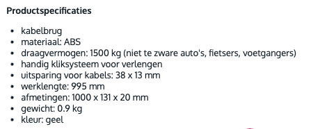 kabelbrug materiaal: ABS ; draagvermogen: 1500 kg (niet te zware auto's, fietsers, voetgangers)handig kliksysteem voor verlengen uitsparing voor kabels: 38 x 13 mm, werklengte: 995 mm, afmetingen: 1000 x 131 x 20 mm, gewicht: 0.9 kg, kleur: geel.