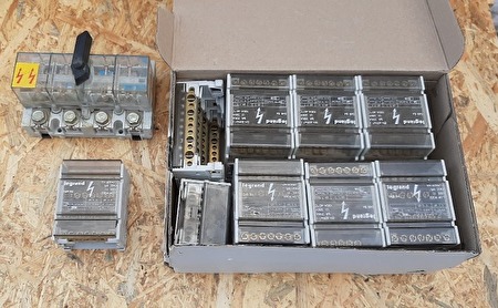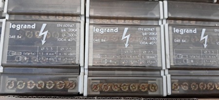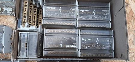 - Verdeler, aansluitklem, distributie blok, verdeelklemmen, rail" LEGRAND " en een schakelaar.