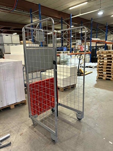 Te koop: een betrouwbare en stevige rolcontainer met 3 metalen zijwanden en een robuuste rode kunststof bodem. Ideaal voor magazijnwerk, intern transport en opslag. De wielen rollen soepel en de container is in goede staat met minimale gebruikssporen.