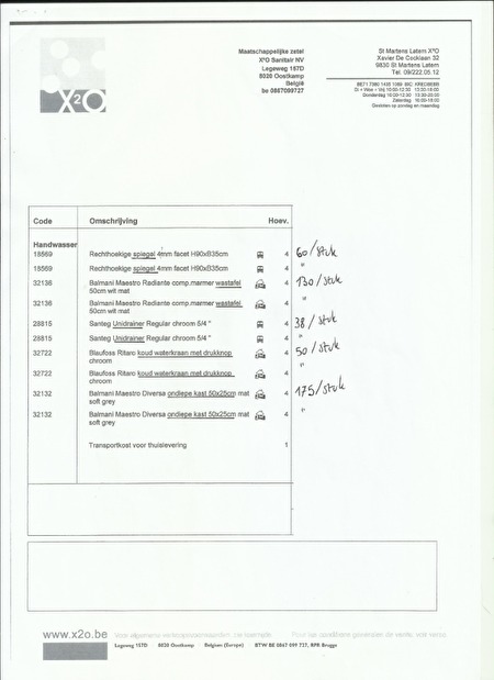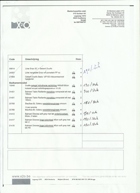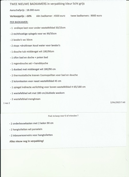 Wegens weigering bouwvergunning te koop volledig sanitair voor een woning,tweemaal een ingerichte badkamer, lavabo's,wc, kasten , kranen,enz...Alles aan -70% op de nieuw aankoopprijs,allrs nog in verpakking,kleur kasten licht grijs .Zie prijzen in infobladen