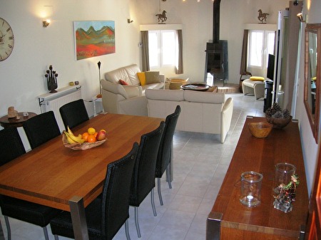 Op het groot zonneterras met zwembad (zuidgericht en met buitendouche), vaste gas BBQ, volledige zomerkeuken met koelkast en 2 buiteneetplaatsen, heeft u een adembenemend en open uitzicht over het berglandschap en de Jalonvallei.