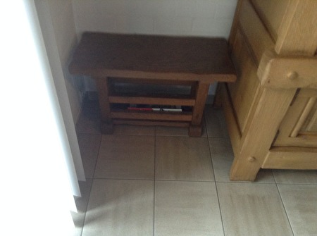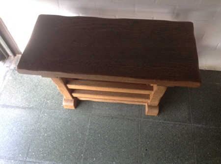 Dagblad houder voorzien van tafelblad in eik Met tafelblad afm. L.= 75 cm ,Br. =34 cm ,Dikte = 4 cm Breedte van de poot 26 cm ,H. van de houder = 46 cm ,kan ook dienen om een bloempot op te plaatsen of iets anders weegt 14 kgKomen halen of verzenden met ;