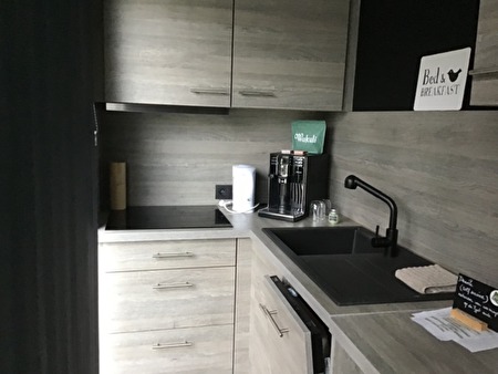 Faciliteiten: tuinstudio met kitchenette, slaapkamer met tweepersoonsbed, douche.