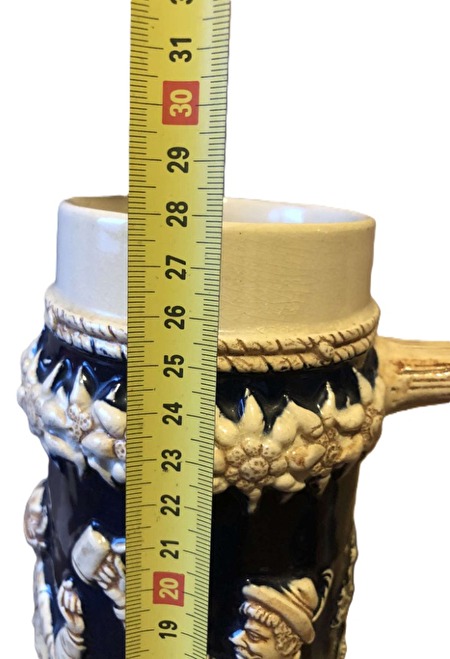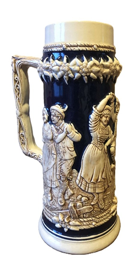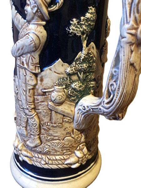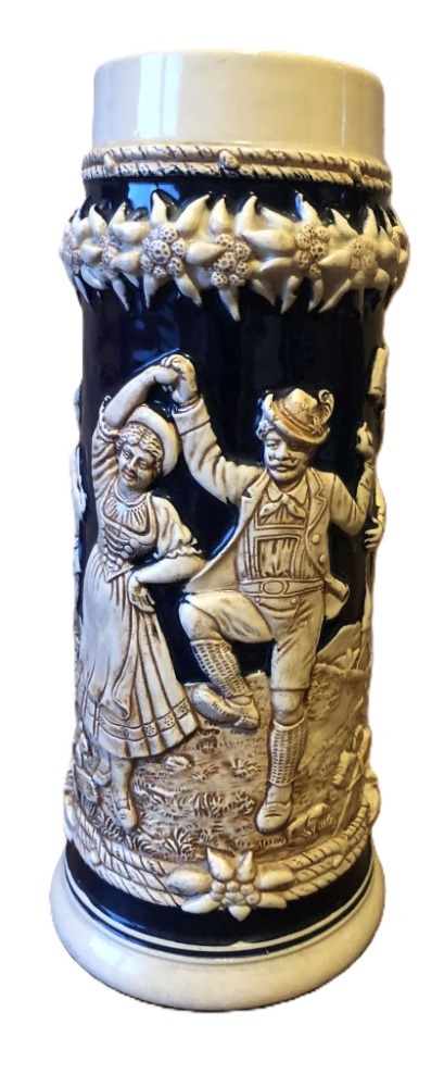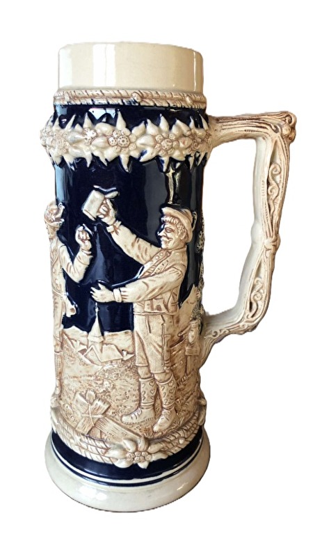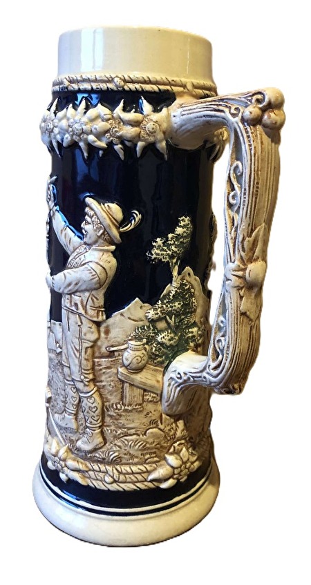 Kleur: Donkerblauw met crèmekleurige reliëfdetails, een klassieke combinatie voor Duitse bierpullen.