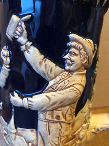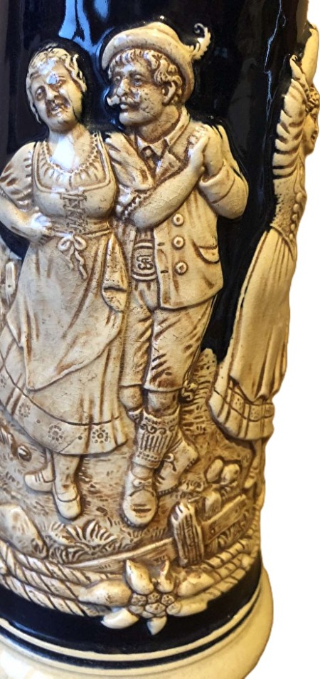 Ontwerp: De bierpul heeft een gedetailleerd reliëfdesign met een scène van feestvierende mensen, typisch voor Beierse of Duitse volkskunst.