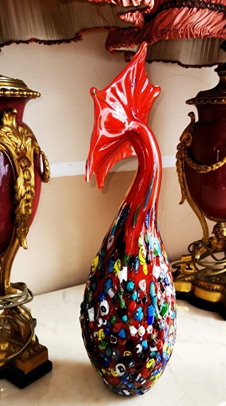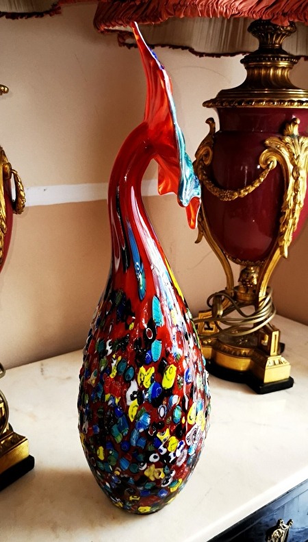 Glaskunstwerk met veel mooie, interessante kleuren. Afmetingen: 52 cm hoog, 15 cm breed, 18 cm lang, in perfecte staat. 500 euro plus verzendkosten.