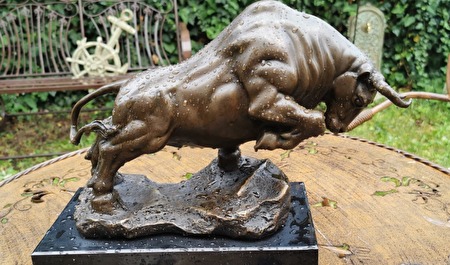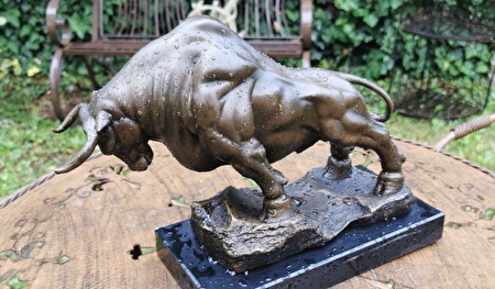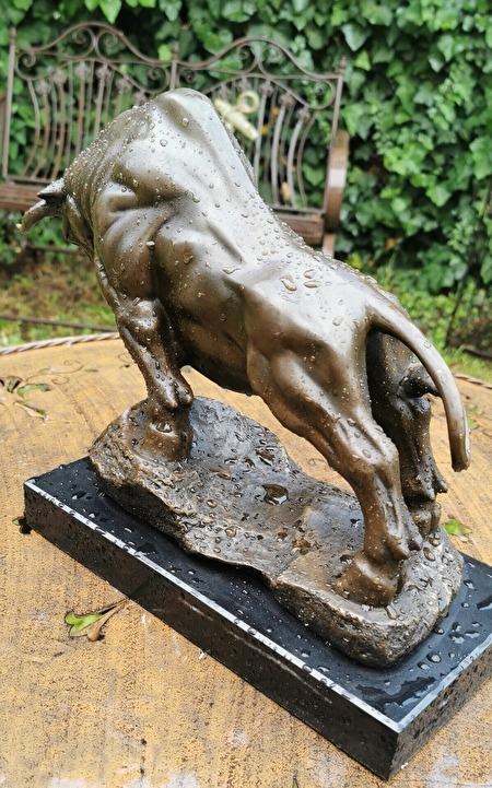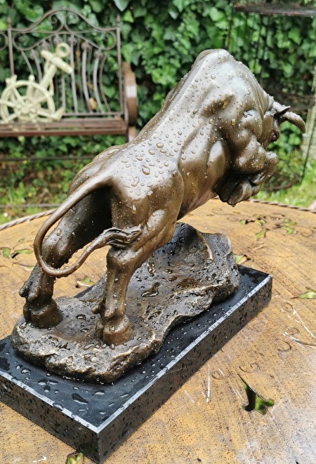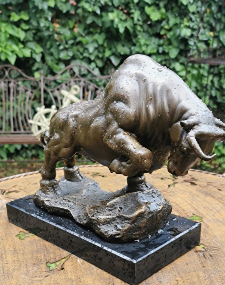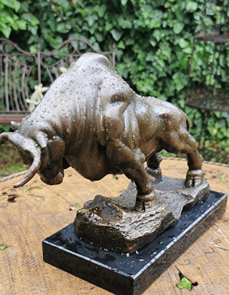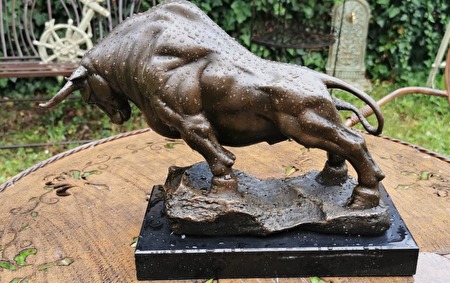 Een majestueus stierenbeeld. Niet alleen een spectaculaire decoratie, maar een waar kunstwerk dat kracht, vastberadenheid en zelfvertrouwen uitstraalt. Een perfecte keuze voor op kantoor, in de woonkamer of zelfs als bijzonder cadeau.Afmetingen: 26 cm hoog, 14 cm breed, 36 cm lang. Massief brons, op een elegante marmeren sokkel. Een kunstwerk met veel details, in uitstekende staat. 800 euro plus verzendkosten.