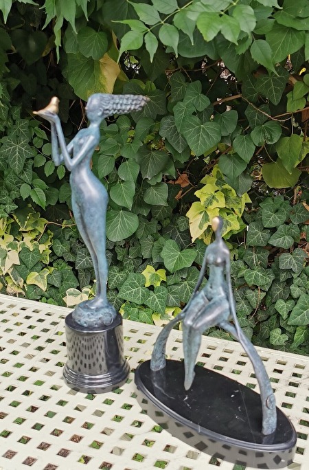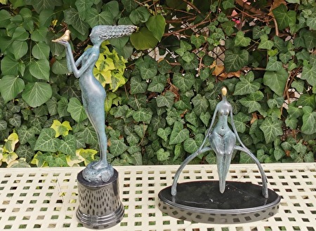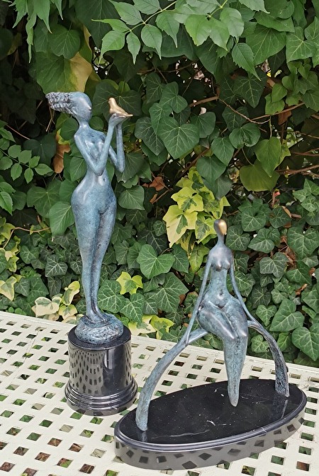 1. Vrouwelijk naakt met een duif – het beeld van de stille verbinding. Blauwgroene patina. 33 cm hoog, 8,5 cm breed, 12,5 cm lang, gesigneerd, op marmeren sokkel, in onberispelijke staat.2. Zittend vrouwelijk naakt – innerlijke kracht en evenwicht in vorm gegoten. Blauwgroene patina. 23 cm hoog, 10 cm breed, 21,5 cm lang, gesigneerd, op marmeren sokkel, in onberispelijke staat.