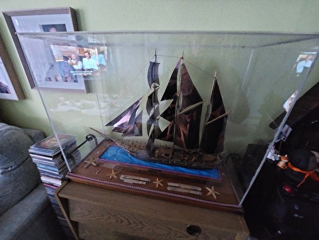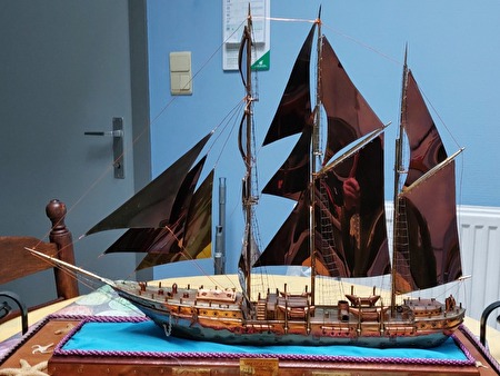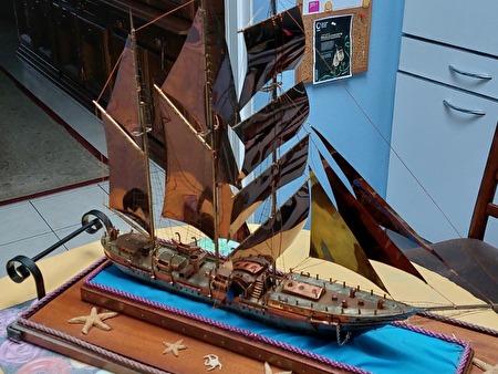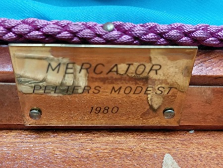 Volledig uit rood en geel koper gemaakt: romp, dek, alles op het dek is in koper (rood of geel), masten, zeilen, zelfs de koorden zijn in koper. Afmetingen boot: L 63cm H 46cm B 24cm. Afmeting met kap: L 83cm H 53cm B 31cm
