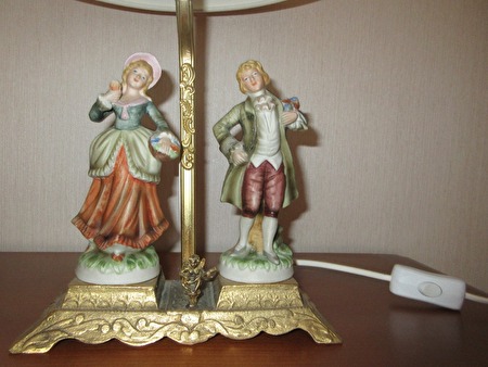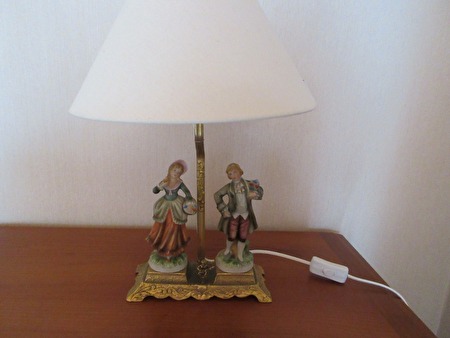 Romantisch tafereeltje. 40cm hoge tafellamp in porselein op koperkleurige voet met cupidootje. 250 cm draad met schakelaartje en witte lampenkap. richtprijs:10 €