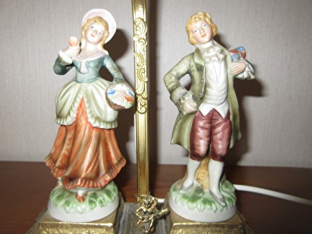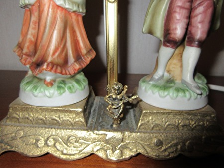 Romantisch tafereeltje. 40cm hoge tafellamp in porselein op koperkleurige voet met cupidootje. 250 cm draad met schakelaartje en witte lampenkap. richtprijs:10 €
