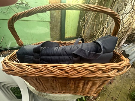 Rieten gevlochten boodschappenmand met rieten draagriem, kan aan fiets worden bevestigd.