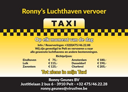 Vervoer naar elke gewenste luchthaven of andere bestemmingen . Wij zijn gevestigd te 3910 Pelt in Noord-Limburg . Bel mij voor inlichtingen of reserveringen op 0475/462228 of 0032475462228 vanuit het buitenland .