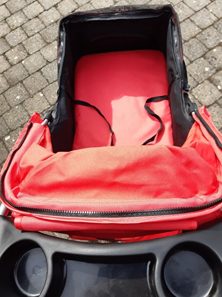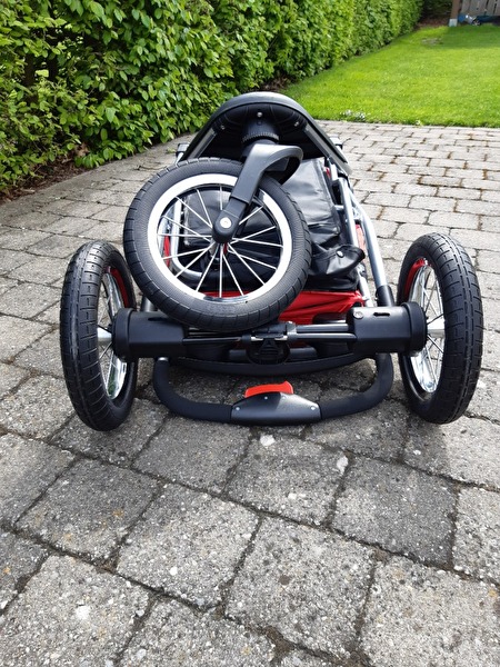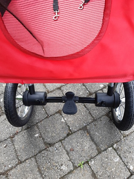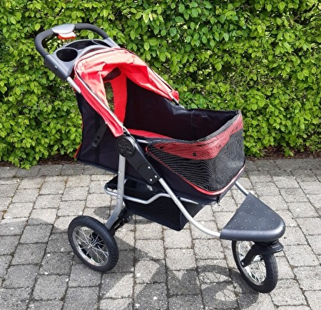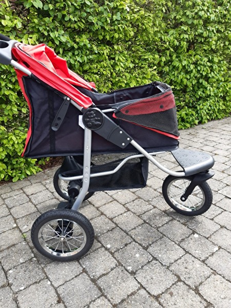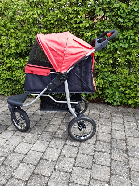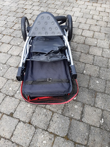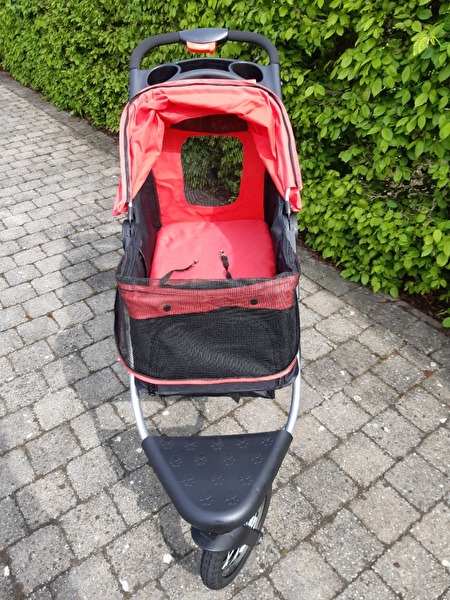 hondenbuggy op 3 grote wielen. volledig plooibaar. max gewicht hond 25 kg. is nooit gebruikt dus nieuw.