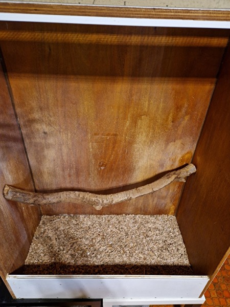 Staat en toepassingTe koop: stevige terrarium van hout, afgewerkt met glazen schuifdeuren.