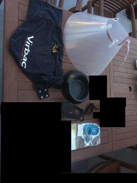 - Honden verzorgingsprodukten en herstelbenodigheden: hondenkol nieuw nooit gedragen (lampenkap XL 30cm), hondenboddy 2XL, kamhandschoen maat L.