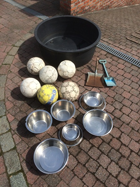 - honden plonsbadje, ballen, eetkommen, kakschupjes, (plonsbad 80cm x 30 cm).
