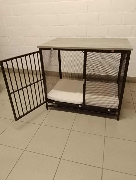 Moderne design bench 80x55x60 , inclusief kussen . Ideaal voor kleinere hond , zo goed als nieuw . Deze staat te koop wegens te klein geworden voor onze hond . Prijs 50 euro , zelf af te halen en cash te betalen .prijs : 50 €