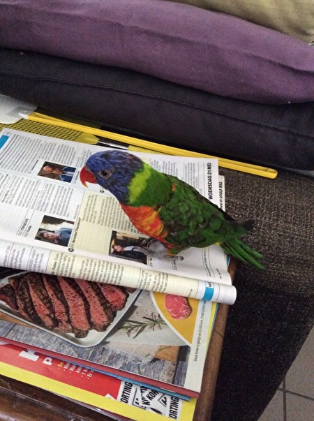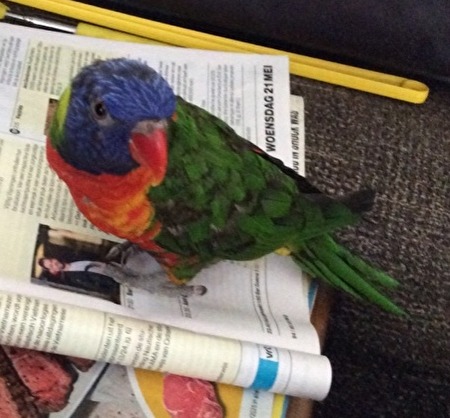 Tamme lori van de blauwe bergen,kan ook al enkele woordjes zeggen.Is een grote speelvogel.