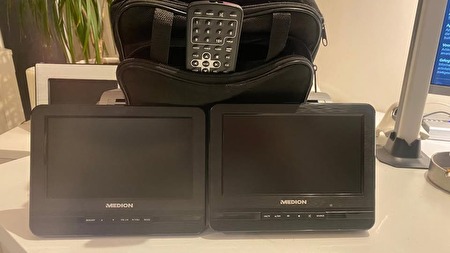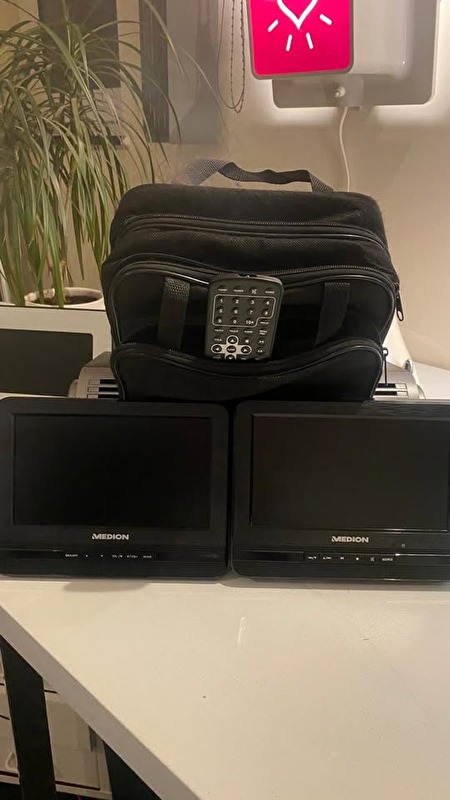 Draagbare dvd-speler Medion met twee digitale schermen in nieuw staat.