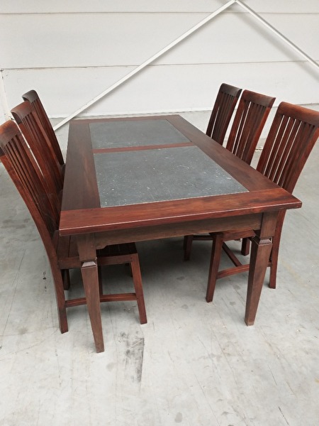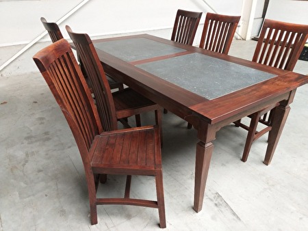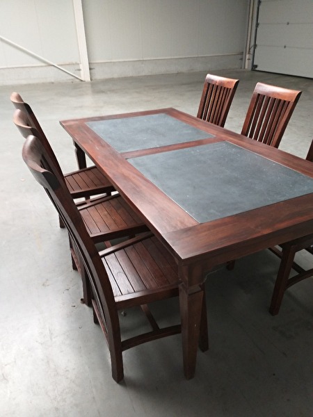 Eetkamer TILQUIN ANTWERPEN Exotisch hout / tafel met 2 ingelegde blauwe hardsteen + 6 stoelen.