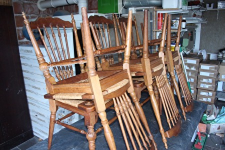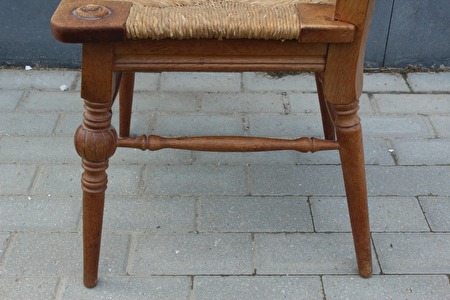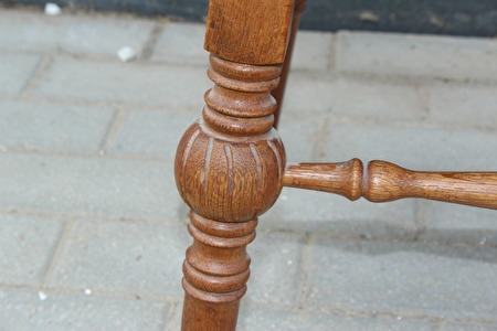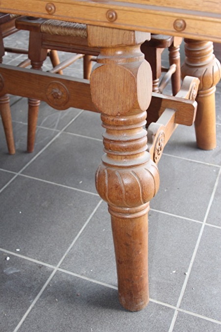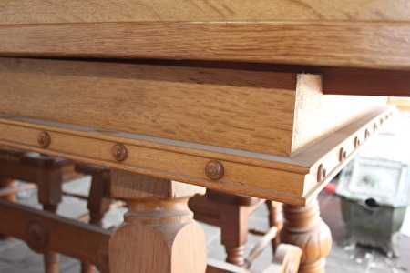 Eiken tafel met 6 bijpassende stoelenFijn bewerkte eiken tafel met 2 uitschuifbare bladen. Tot 10 zitplaatsen.